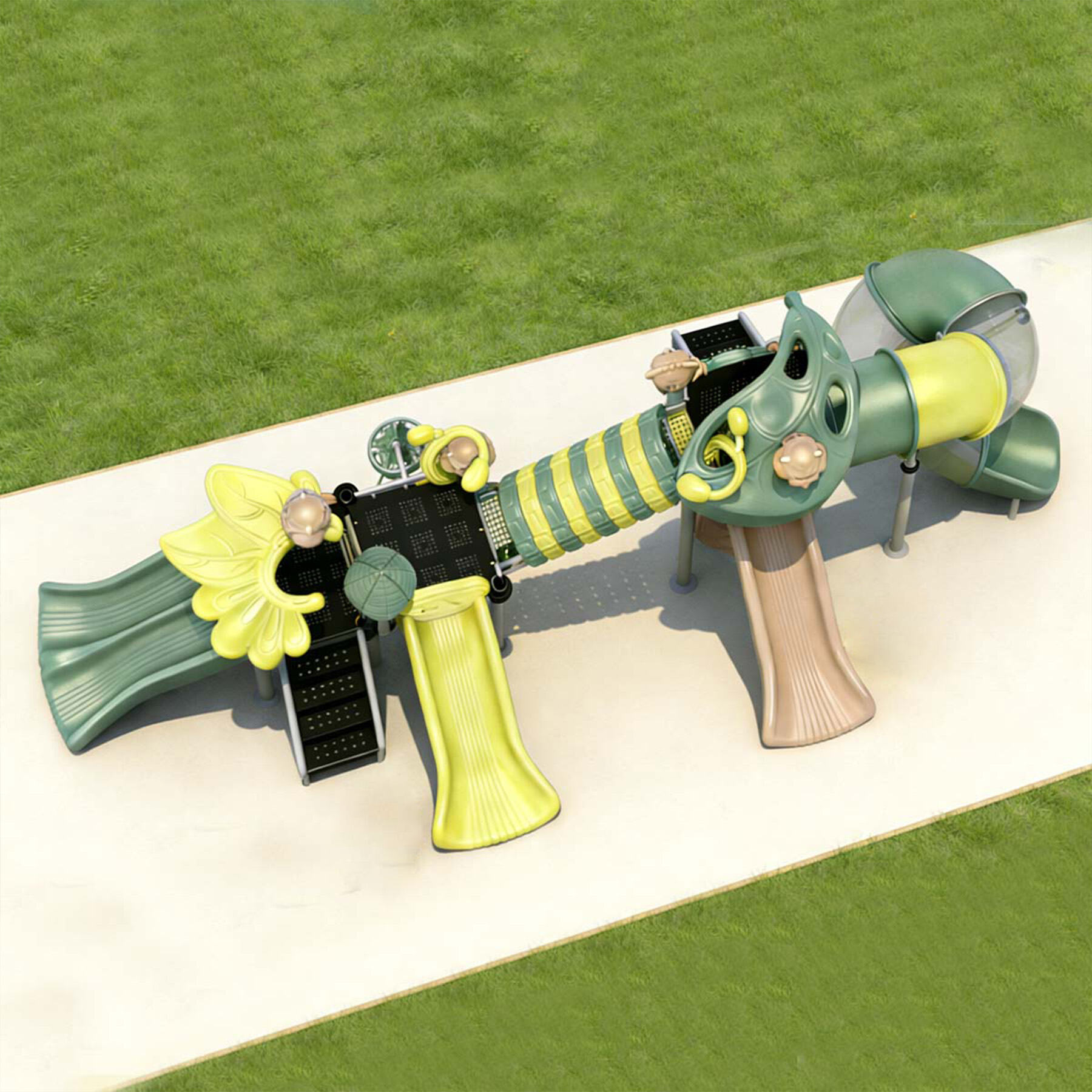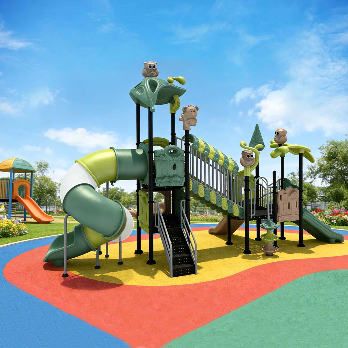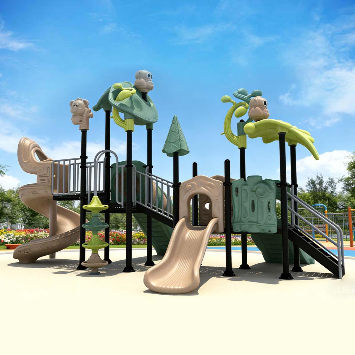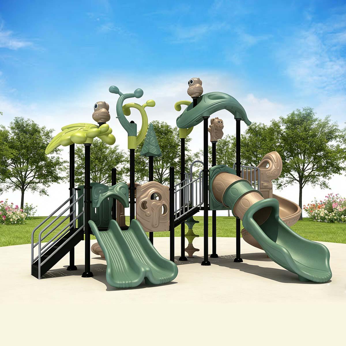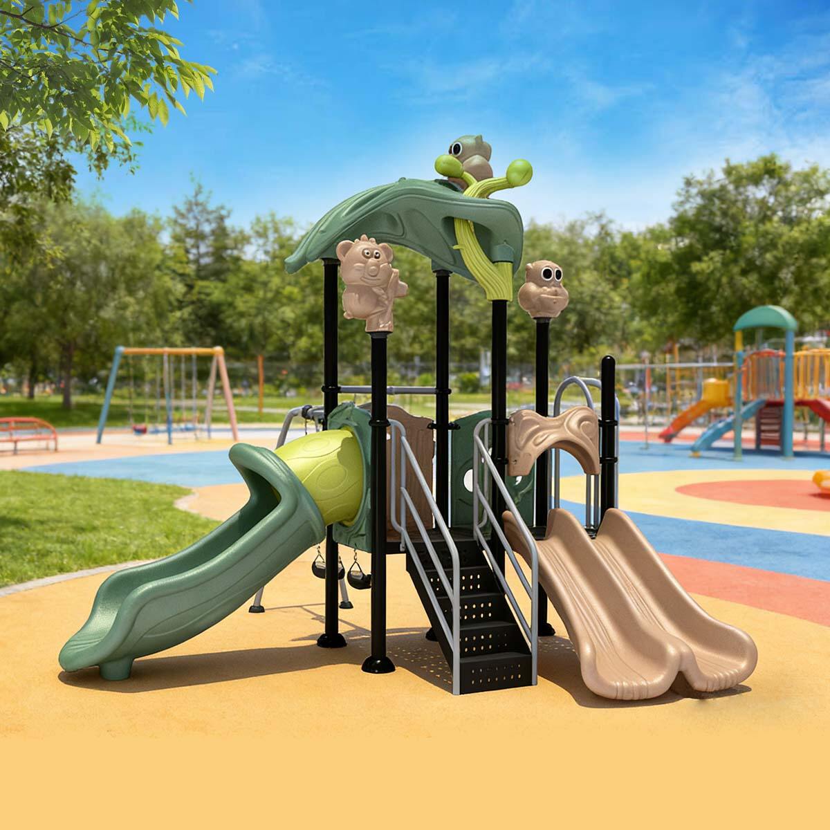 The slides are made from imported plastic treated with anti-UV and anti-static processes to prevent aging, surface static, and color fading. The support posts are constructed from galvanized steel, enhanced with baking finish and UV stabilizers, ensuring corrosion and rust resistance while keeping colors vibrant and long-lasting.