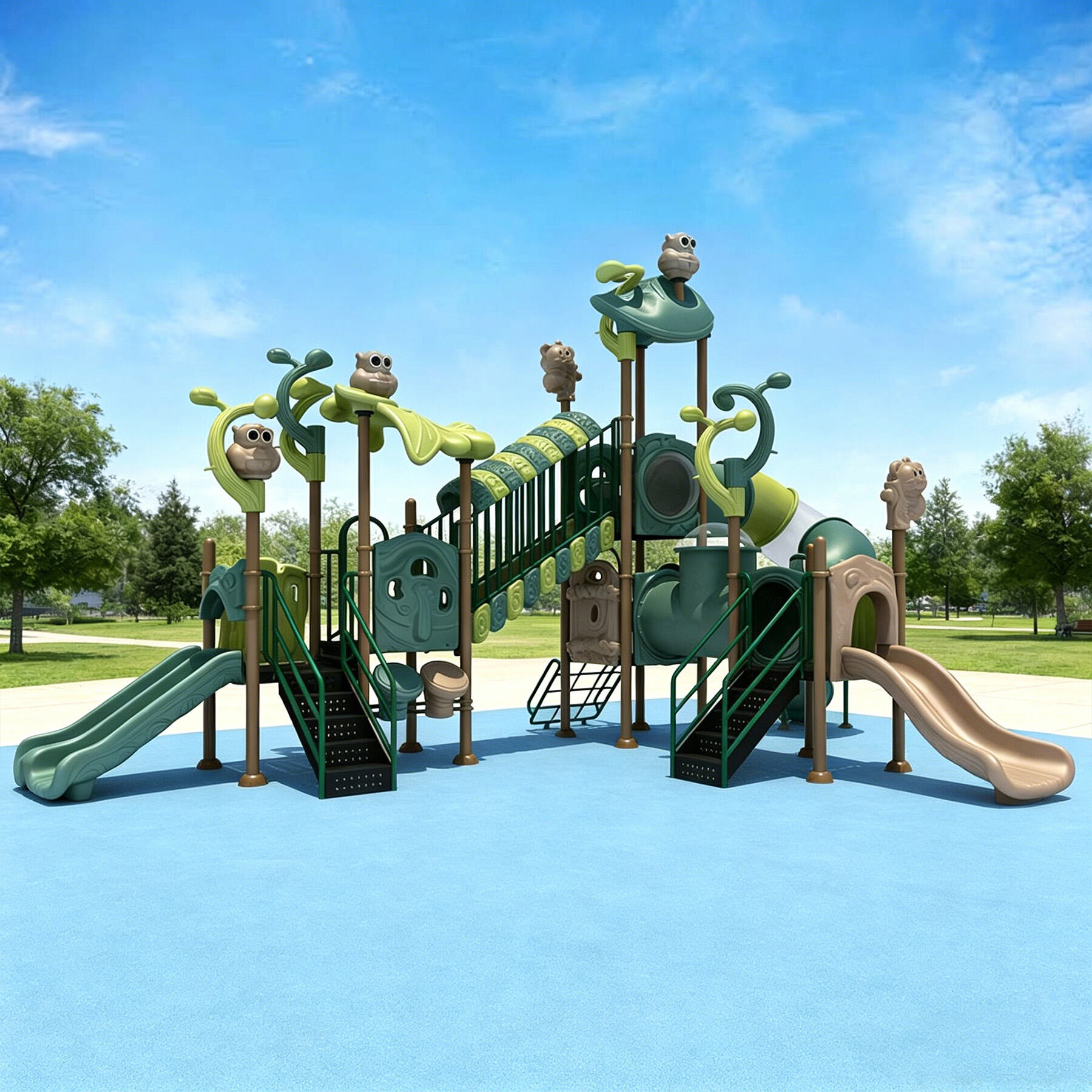 The surfaces replicate natural textures such as bark patterns, tree holes, and leaf veins, with seamless molding that ensures smooth, safe edges. Incorporating IP characters like owls, koalas, and squirrels, the design creates rich visual layering and conveys a strong natural atmosphere. The varied tactile textures allow children to touch and feel, transforming static equipment into an interactive “encyclopedia of nature.”
