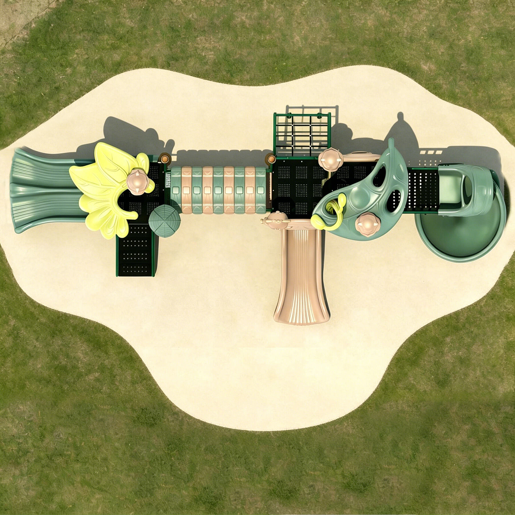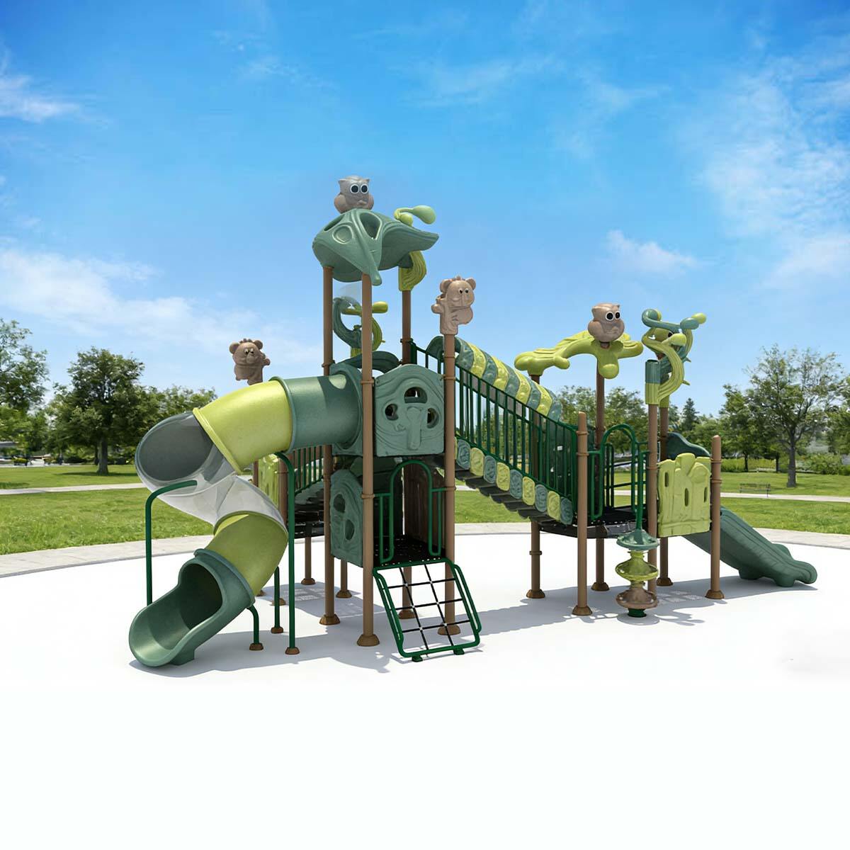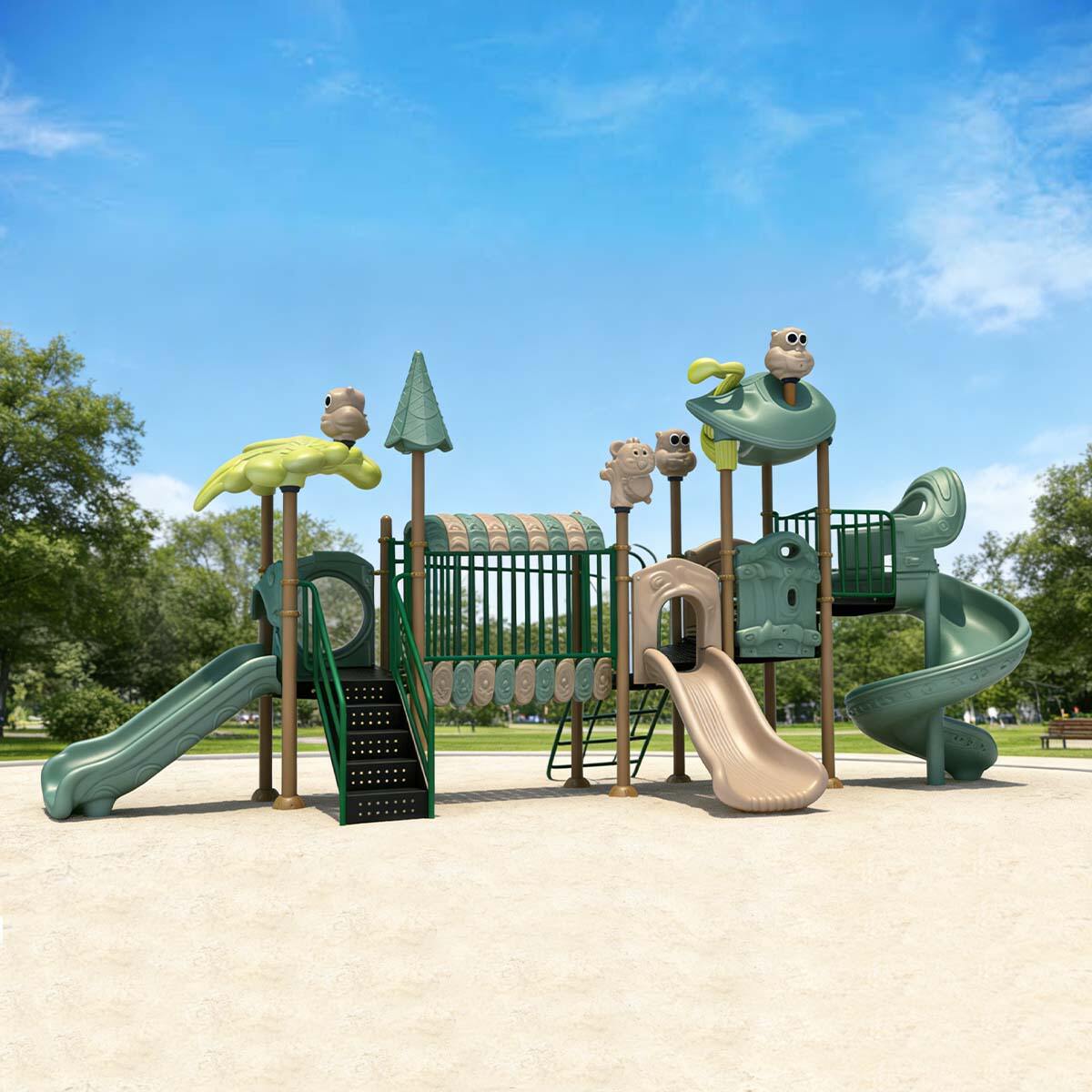 Staggered platforms, hollow tree-hole panels, and hanging animal decorations allow light to create rich patterns across the structure. As children climb and slide, they can directly experience the dynamic flow of light and shadow with their movements, bringing a vibrant artistic expression to the otherwise static play equipment and making the natural theme come alive.