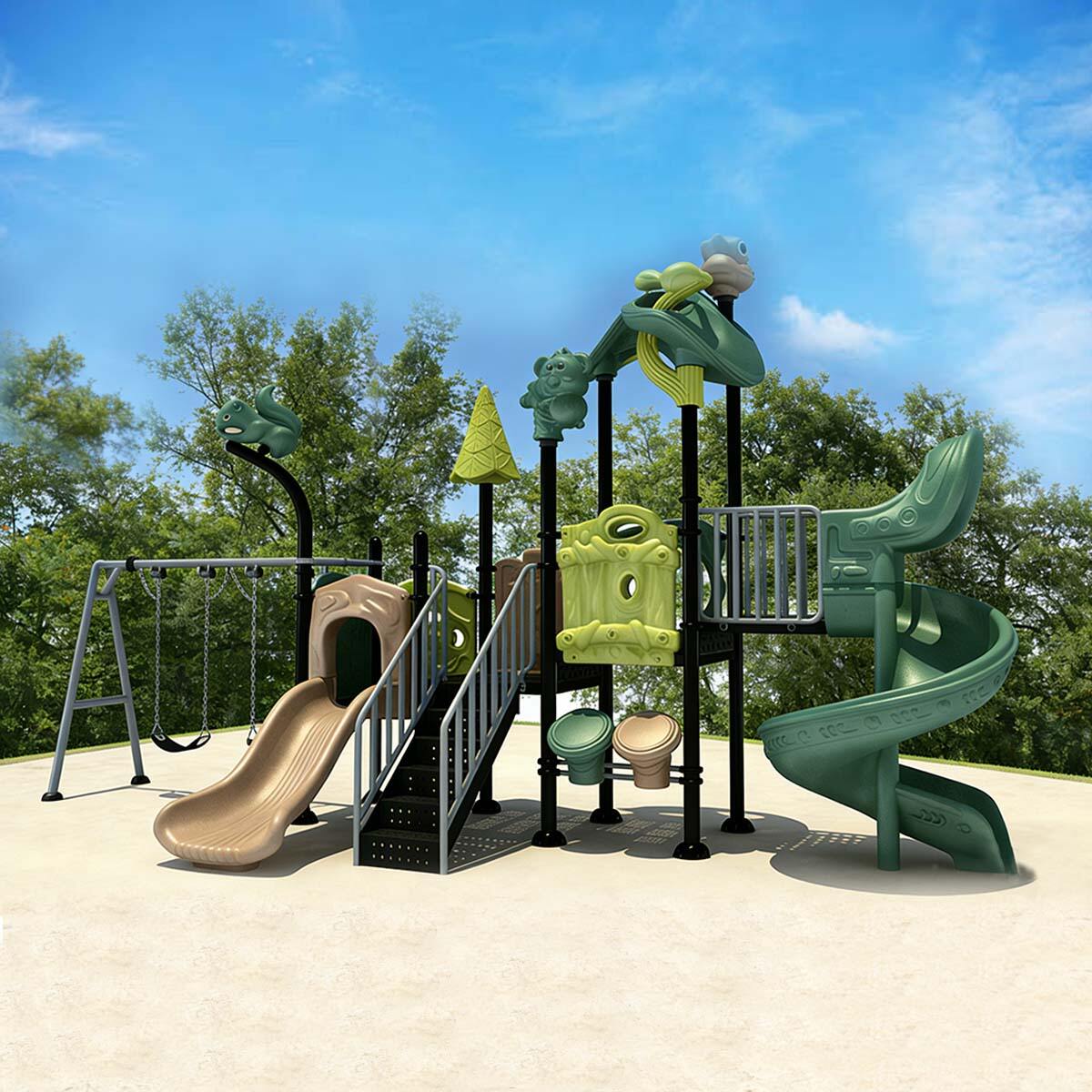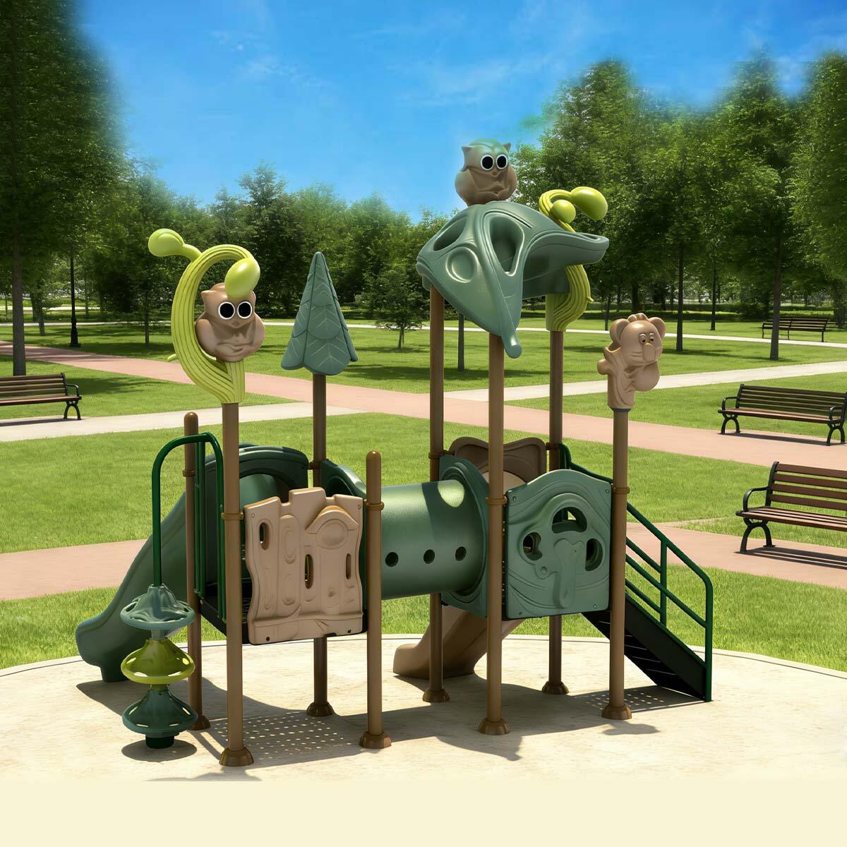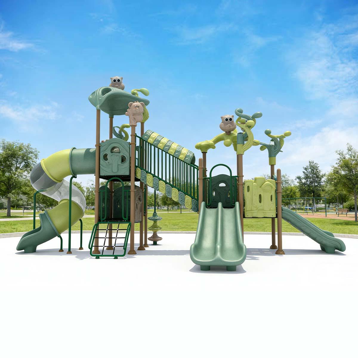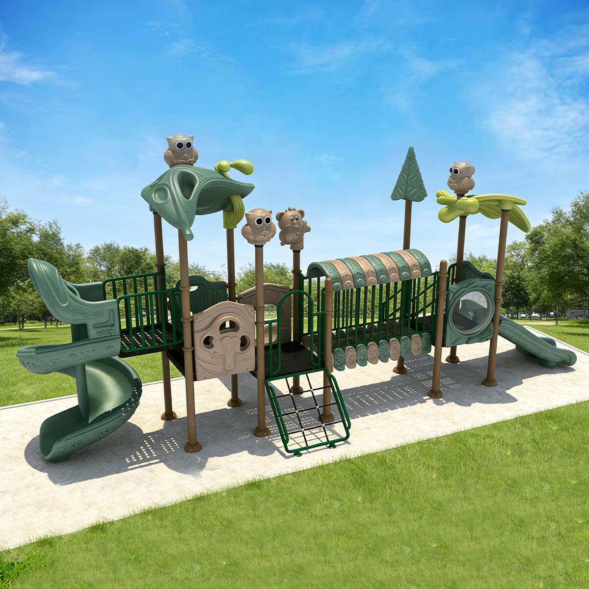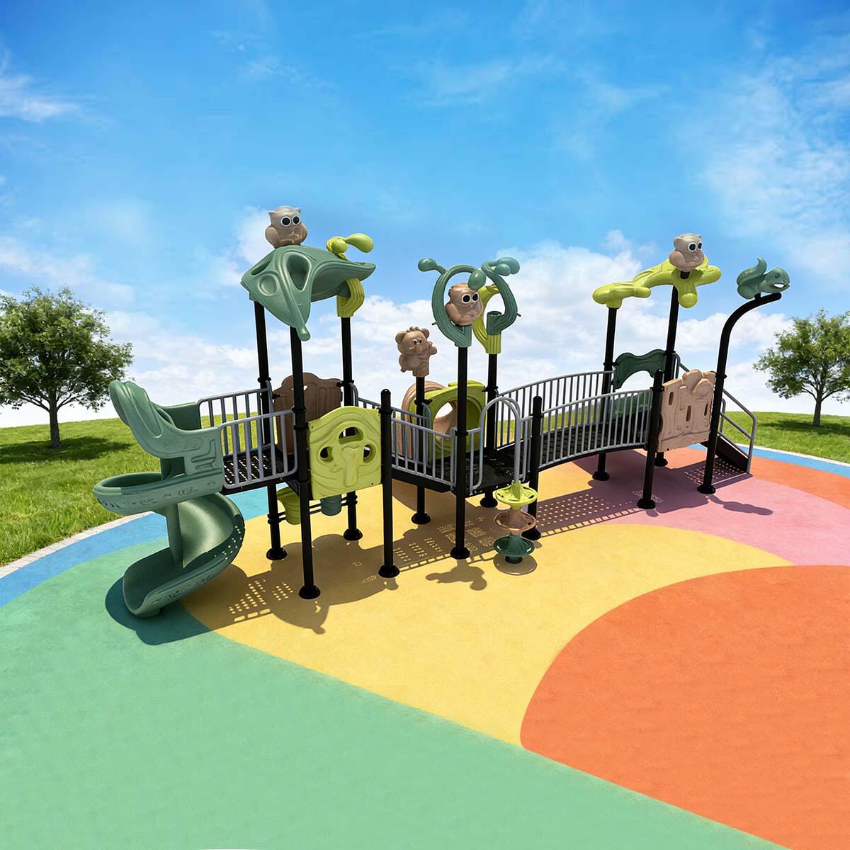 Forest Series Slide is designed around the core theme of jungle animals and pristine nature, incorporating elements such as owls, squirrels, tree stumps, and vines throughout the structure. The color-coded zones clearly define functional areas, while warm tones create a cozy and inviting atmosphere, encouraging children to explore actively in a visually comfortable environment.