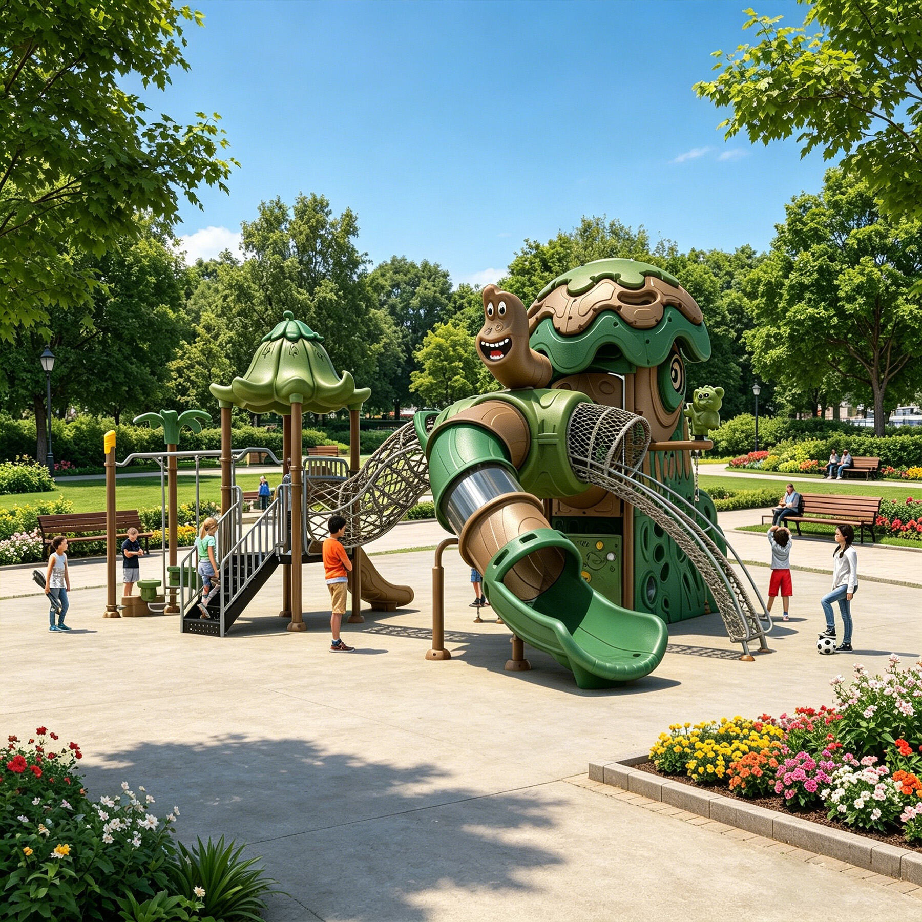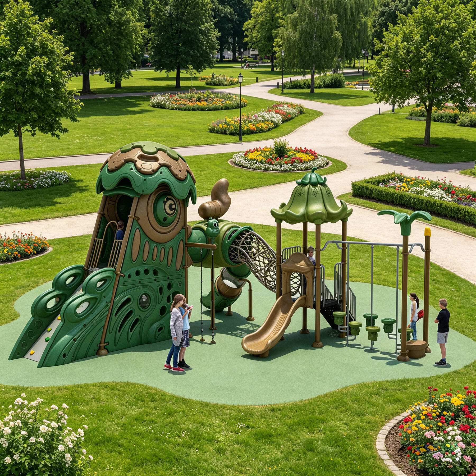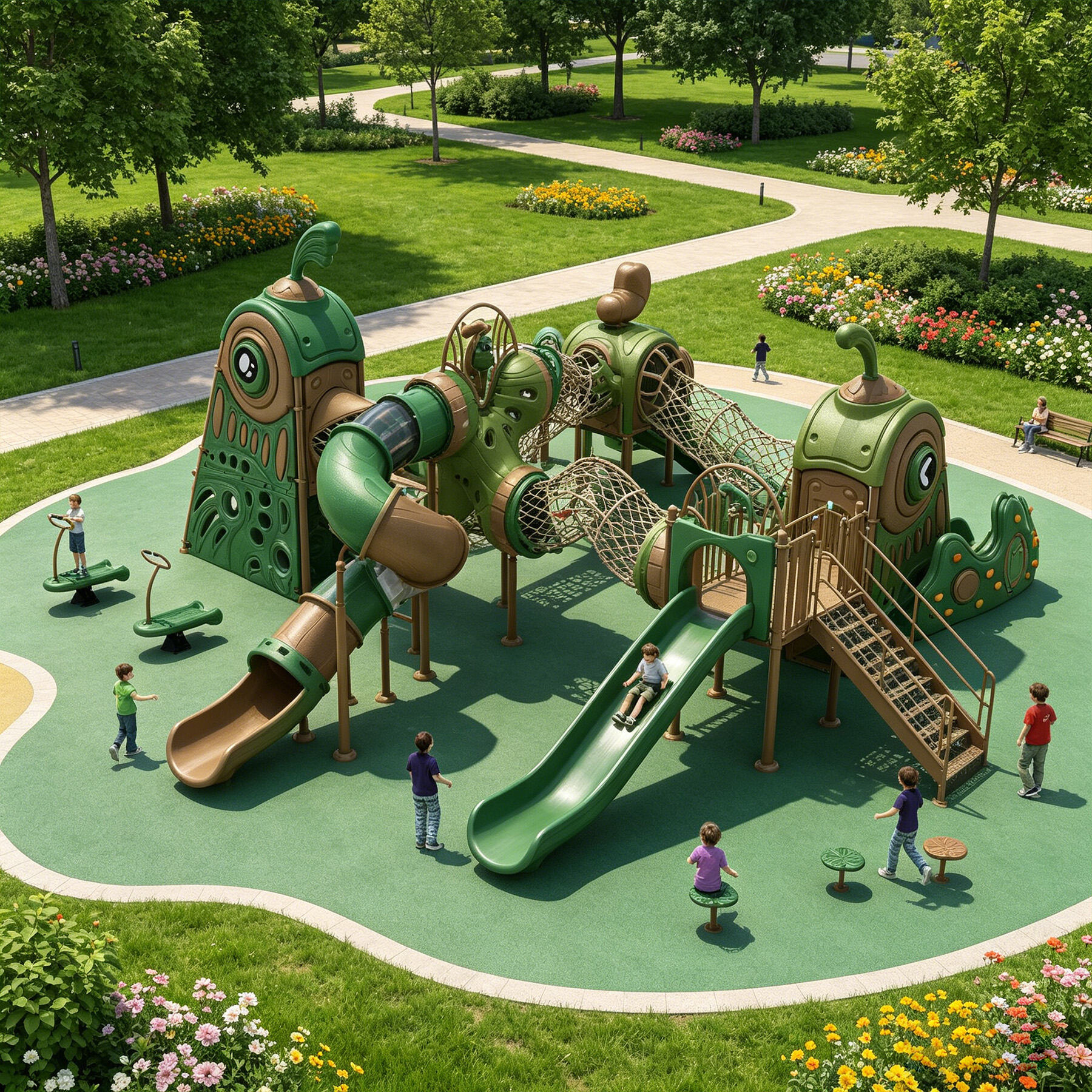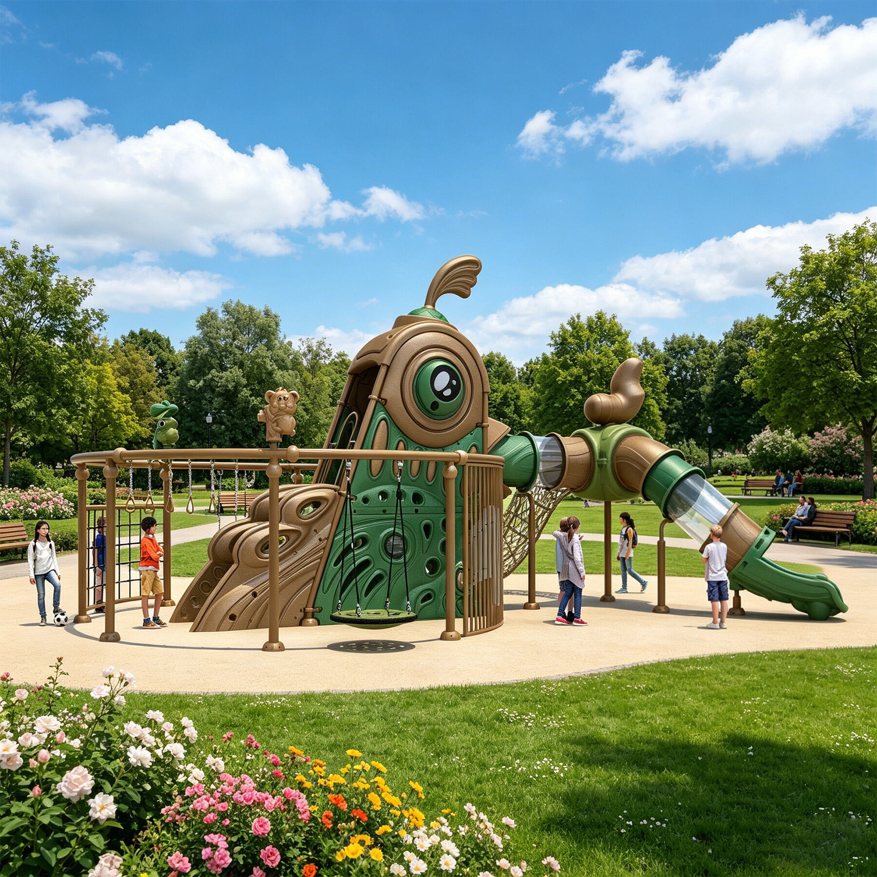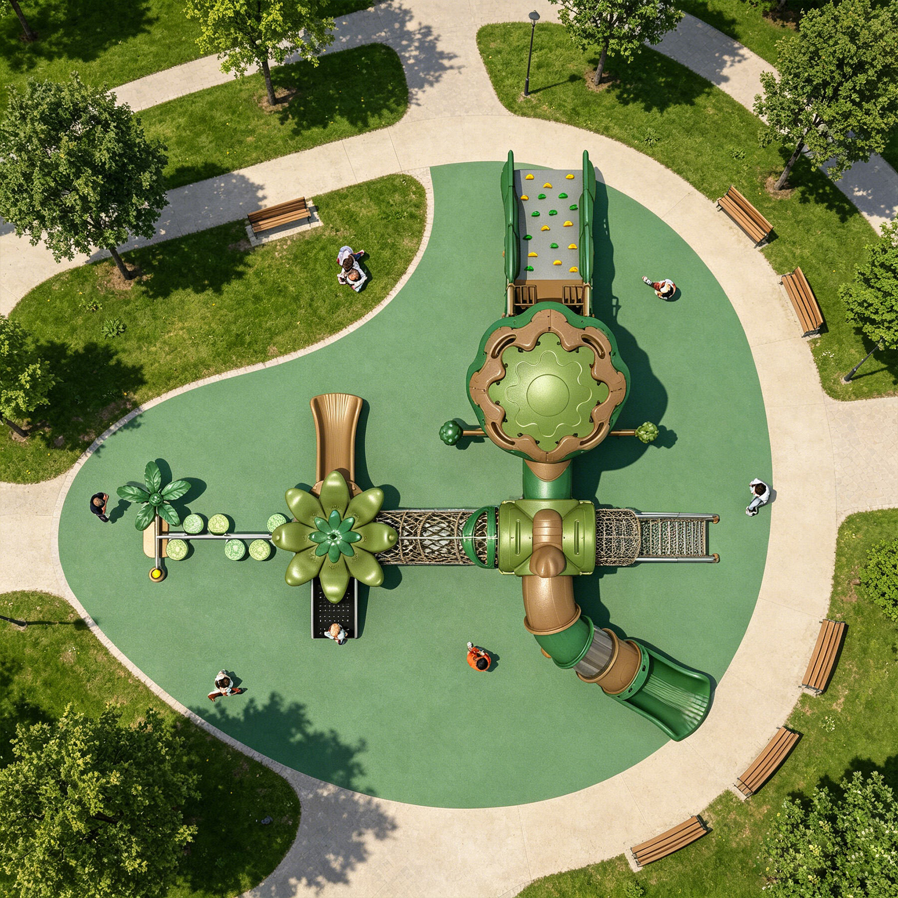 Smooth curves and a layered green-brown color scheme recreate the textures of natural ecosystems while whimsical, child-friendly anthropomorphic designs eliminate any industrial feel. The result is a visually enchanting playground that awakens children’s curiosity and inspires imaginative exploration.