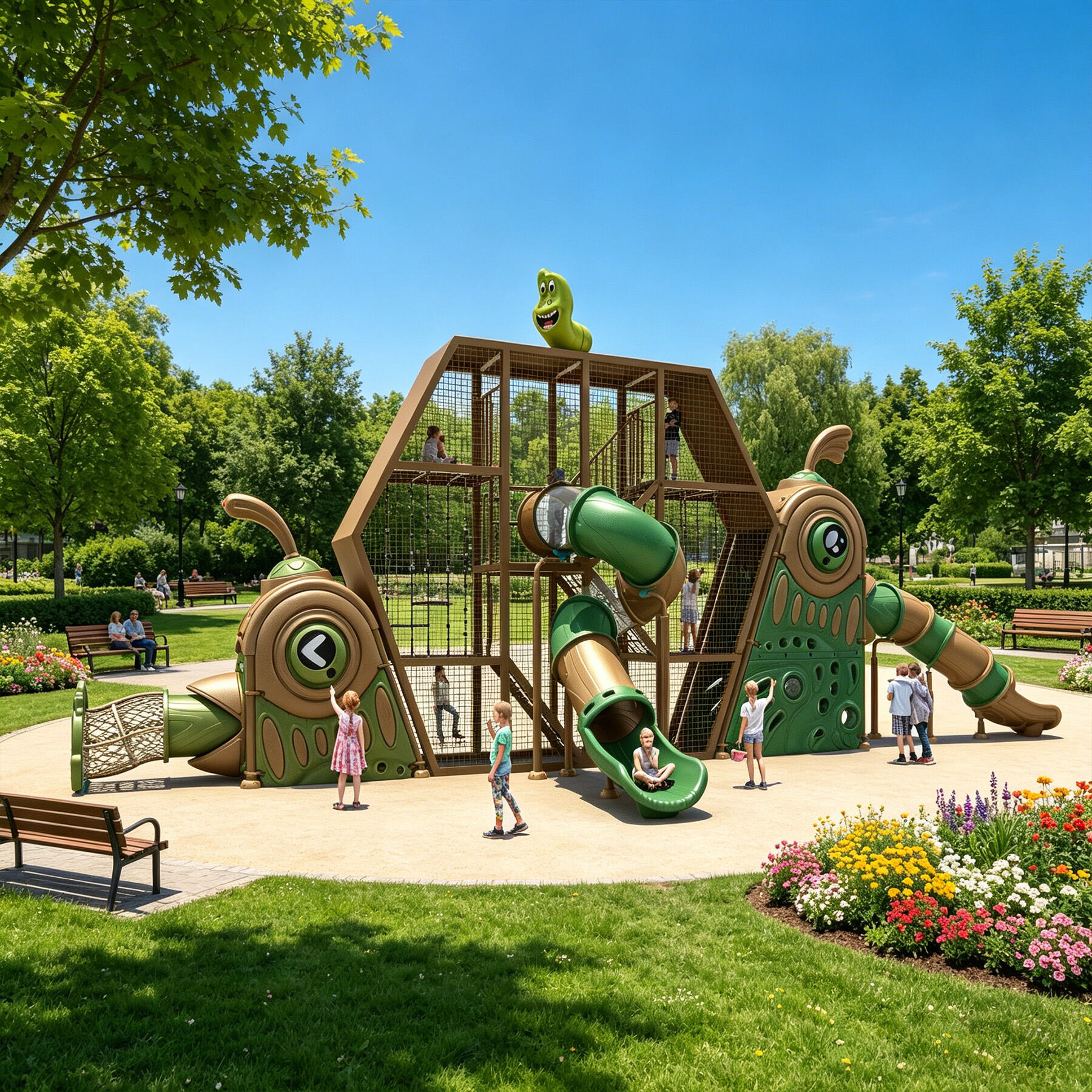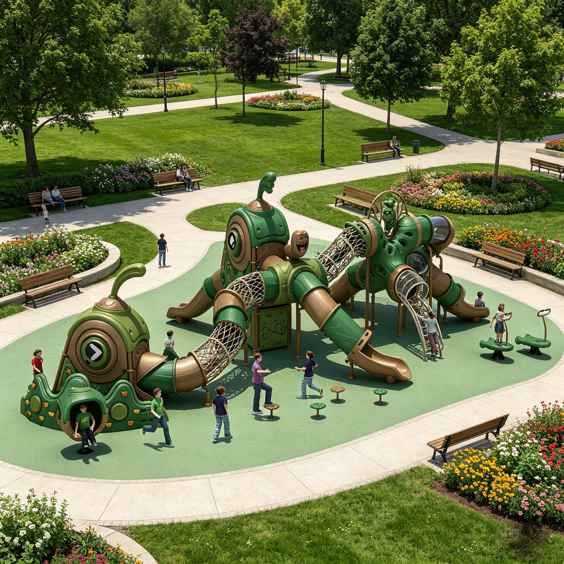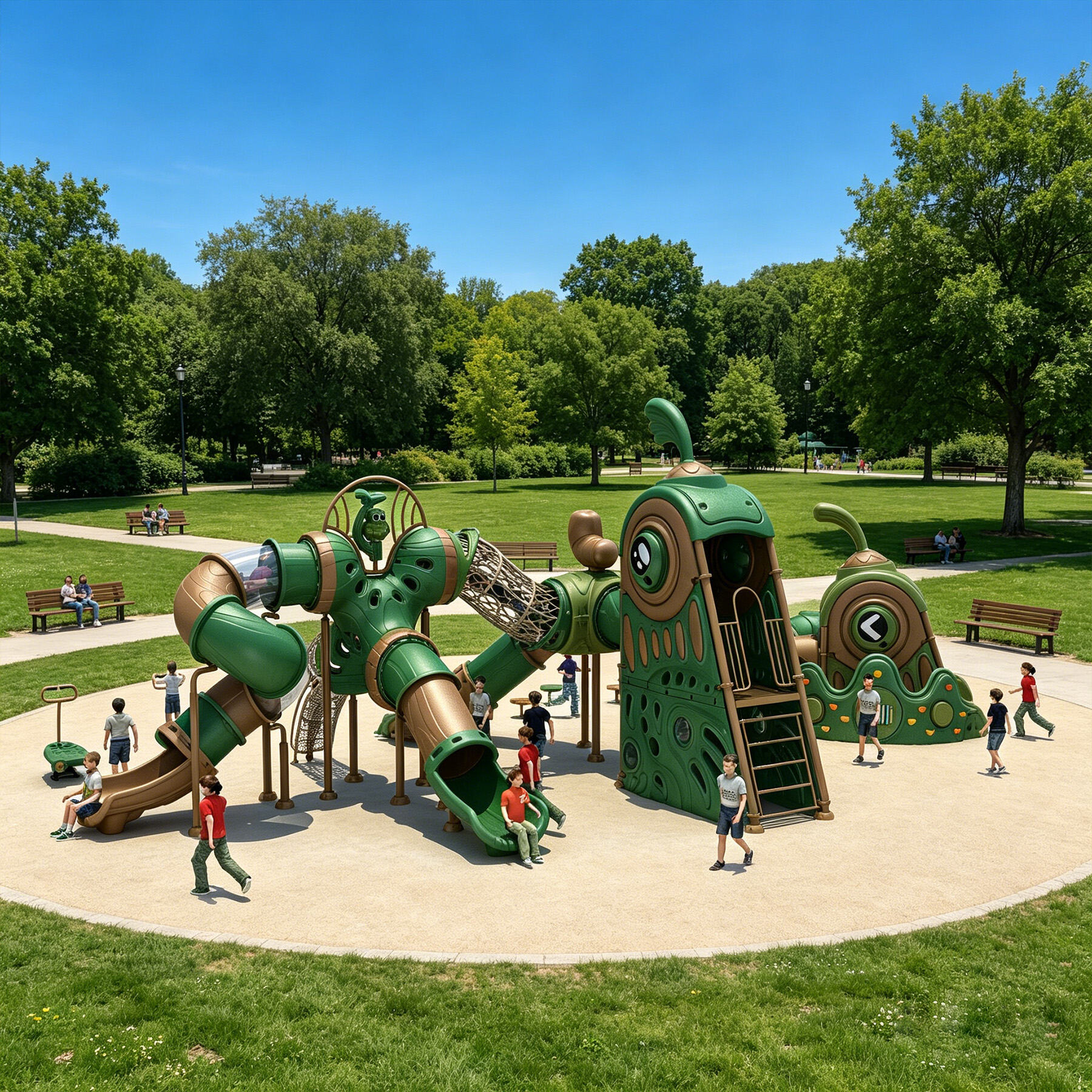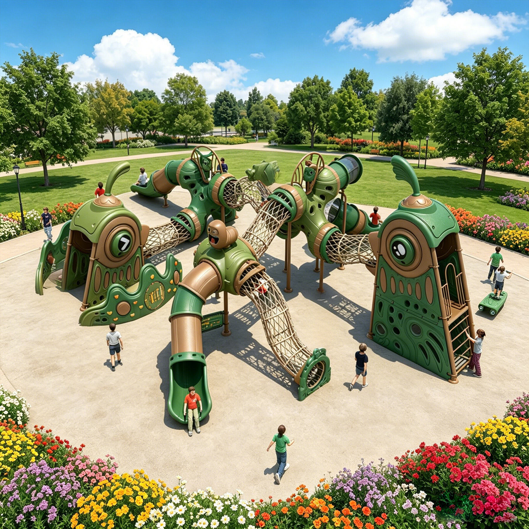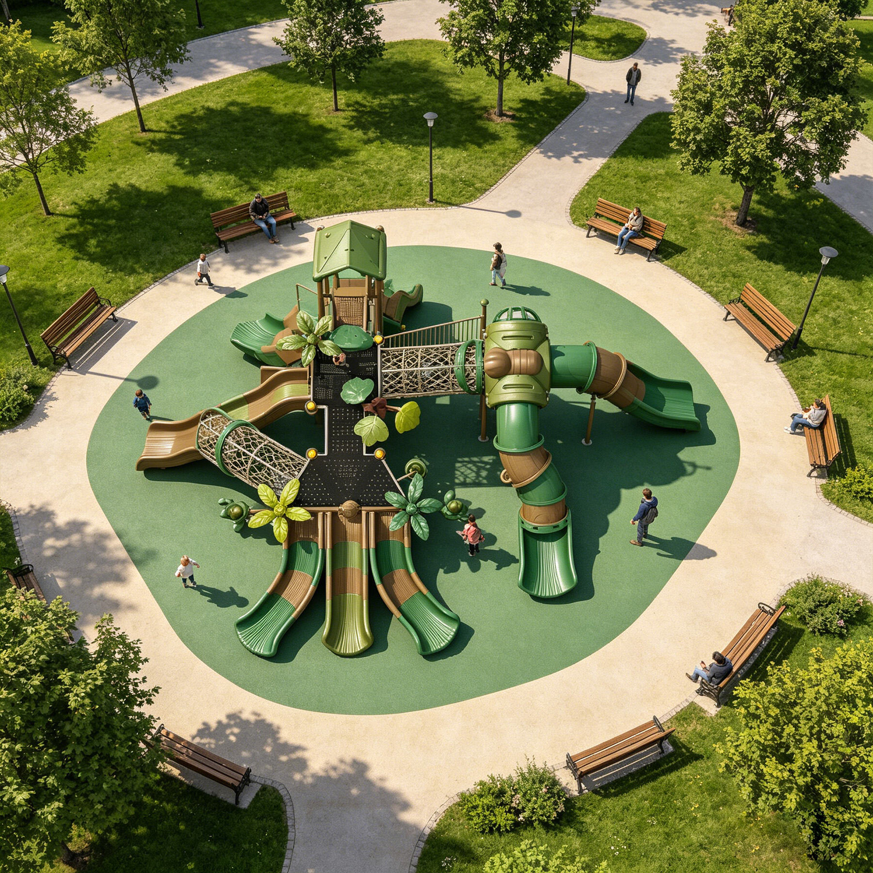 Smooth curves and a layered green-brown color scheme recreate the textures of natural ecosystems while whimsical, child-friendly anthropomorphic designs eliminate any industrial feel. The result is a visually enchanting playground that awakens children’s curiosity and inspires imaginative exploration.