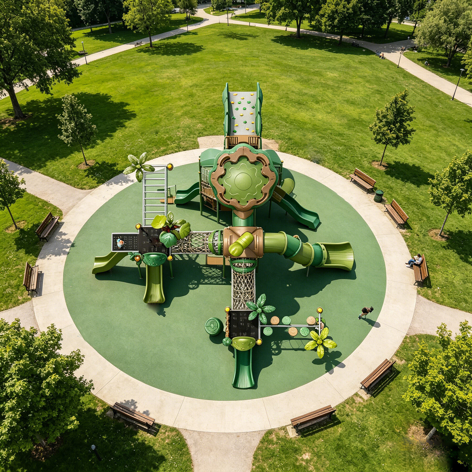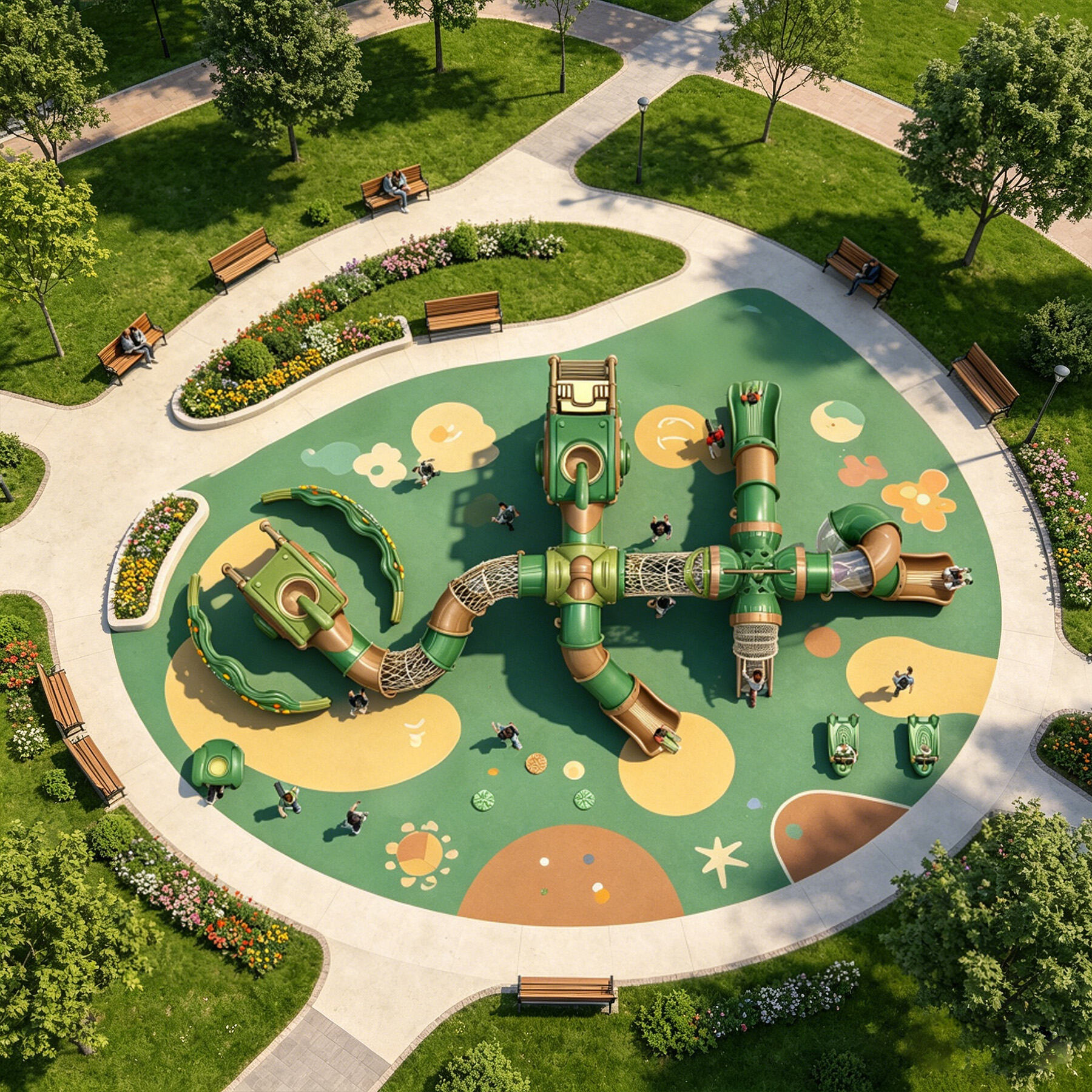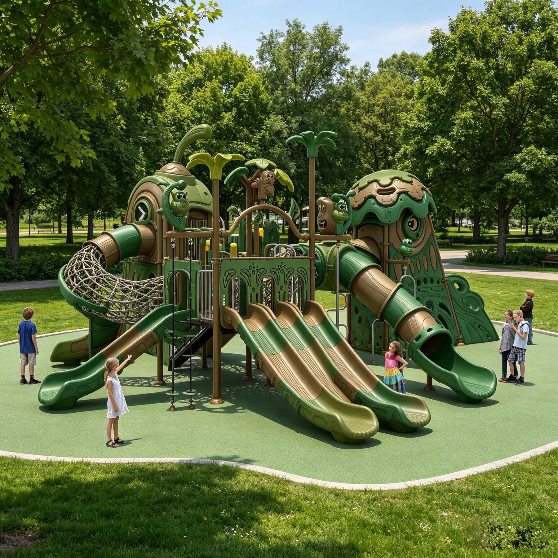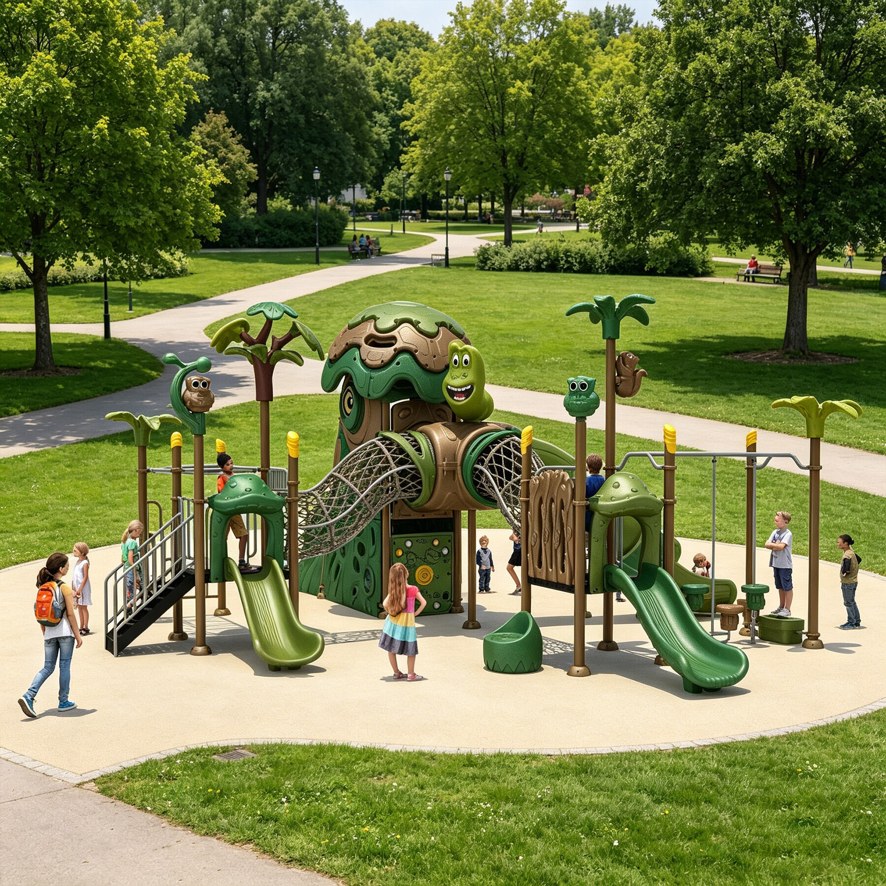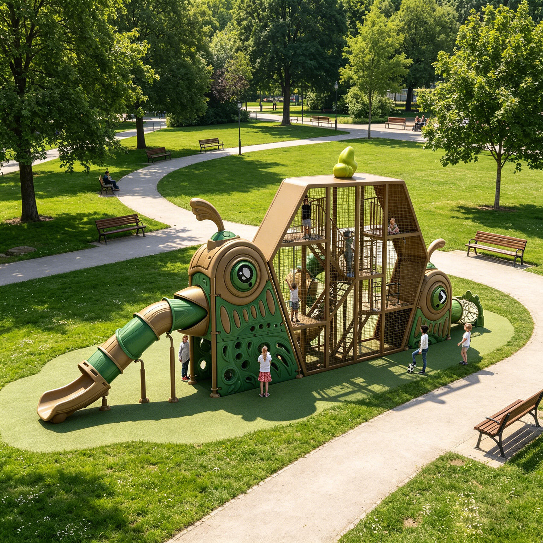 Smooth curves and a layered green-brown color scheme recreate the textures of natural ecosystems while whimsical, child-friendly anthropomorphic designs eliminate any industrial feel. The result is a visually enchanting playground that awakens children’s curiosity and inspires imaginative exploration.