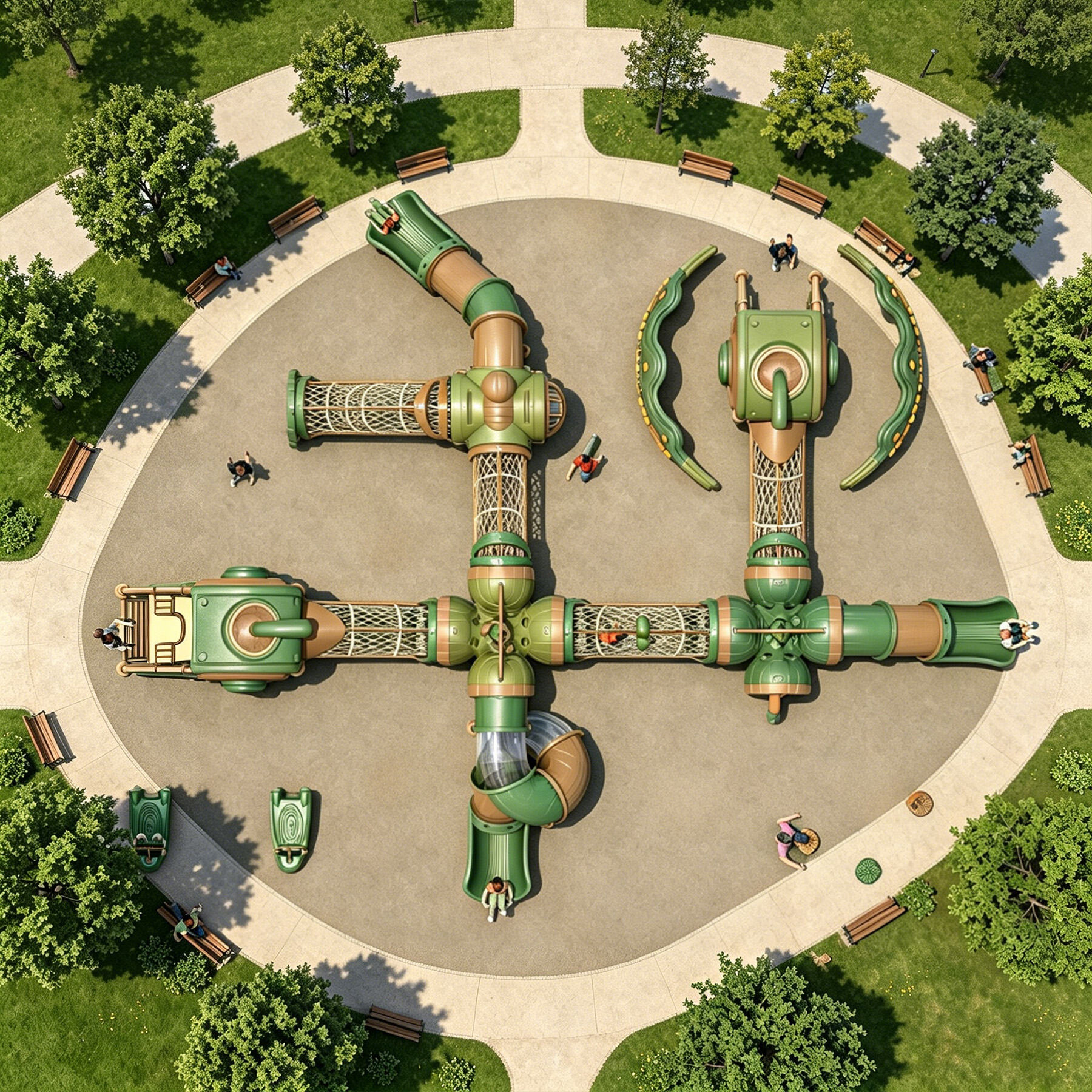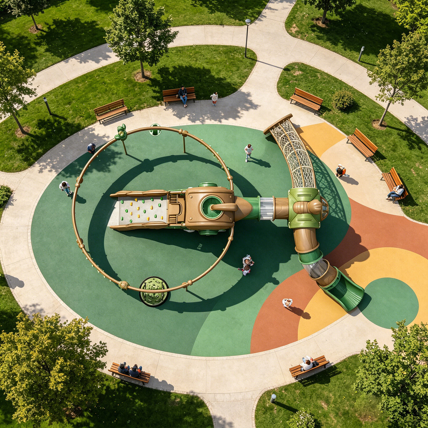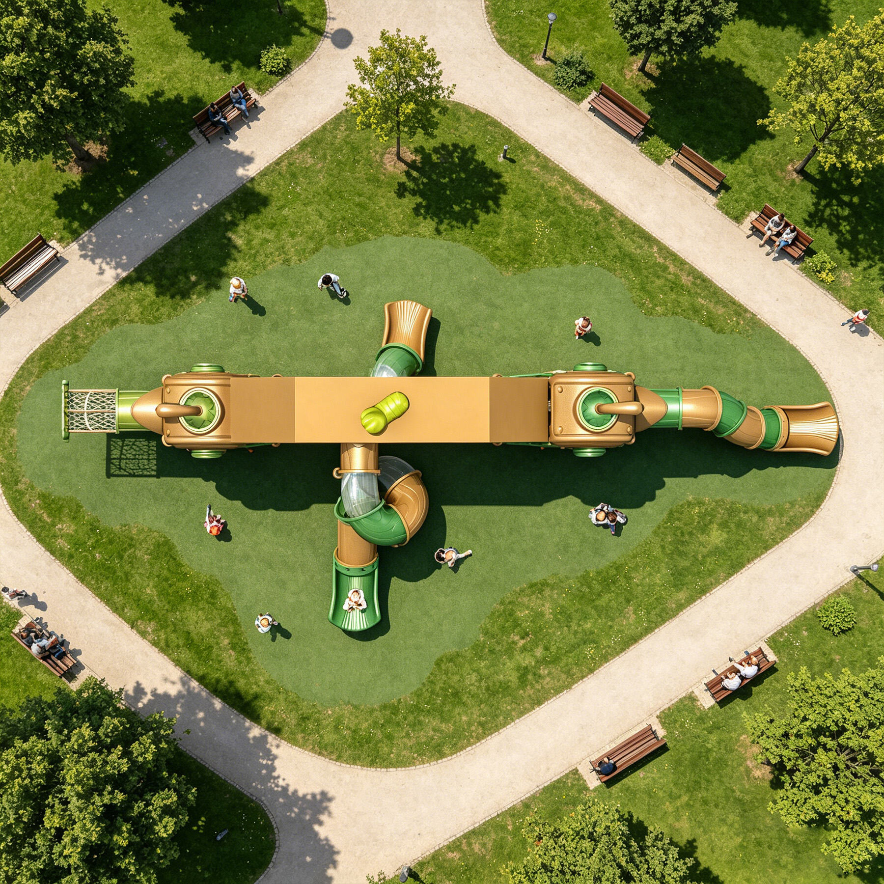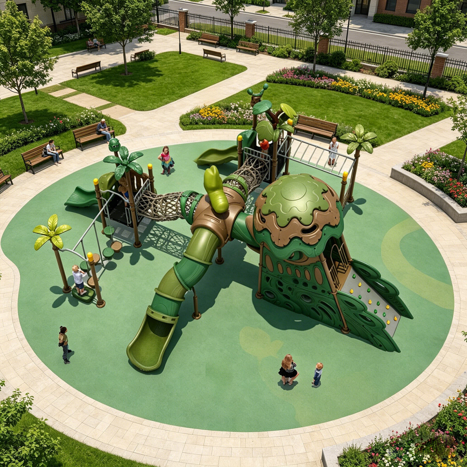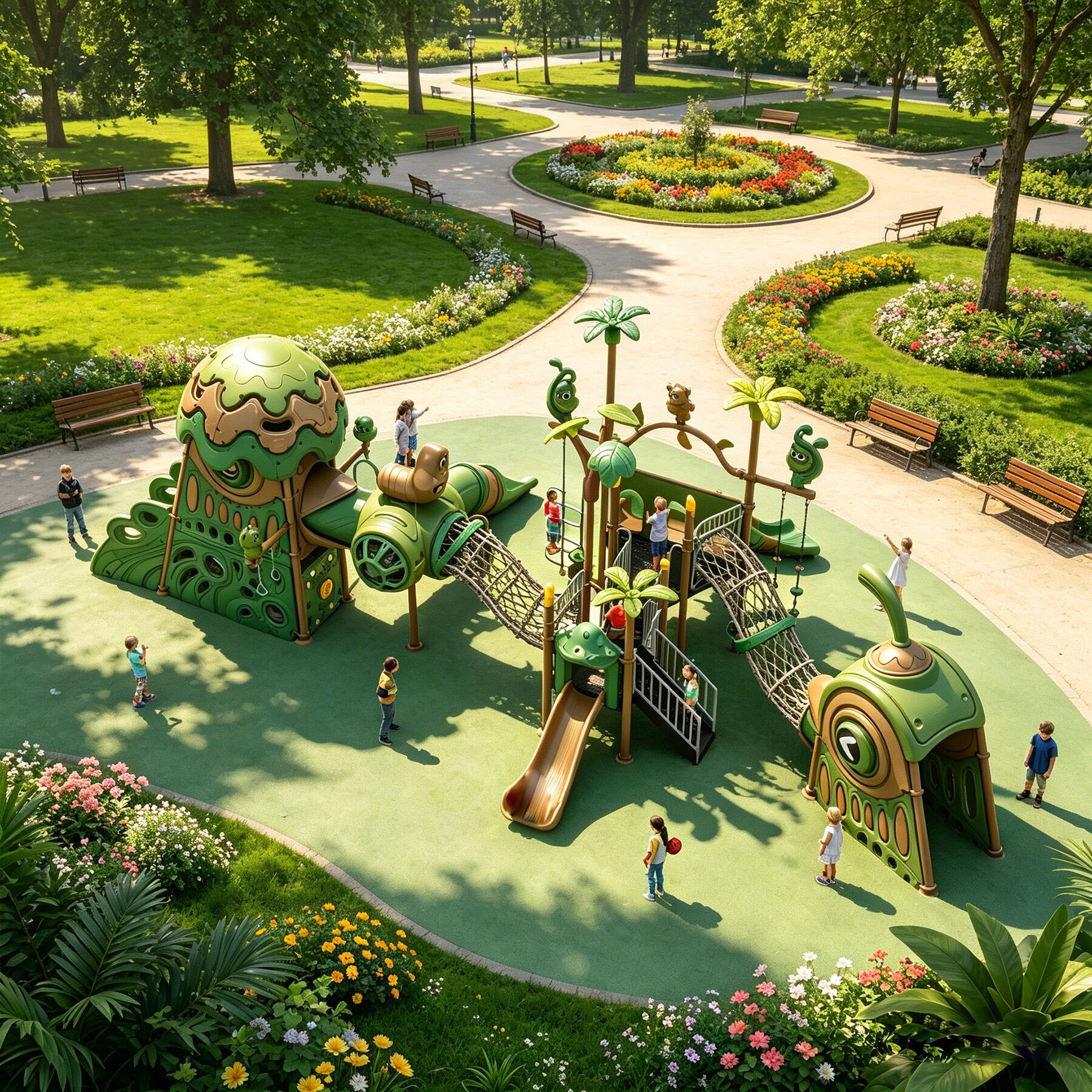 Smooth curves and a layered green-brown color scheme recreate the textures of natural ecosystems while whimsical, child-friendly anthropomorphic designs eliminate any industrial feel. The result is a visually enchanting playground that awakens children’s curiosity and inspires imaginative exploration.