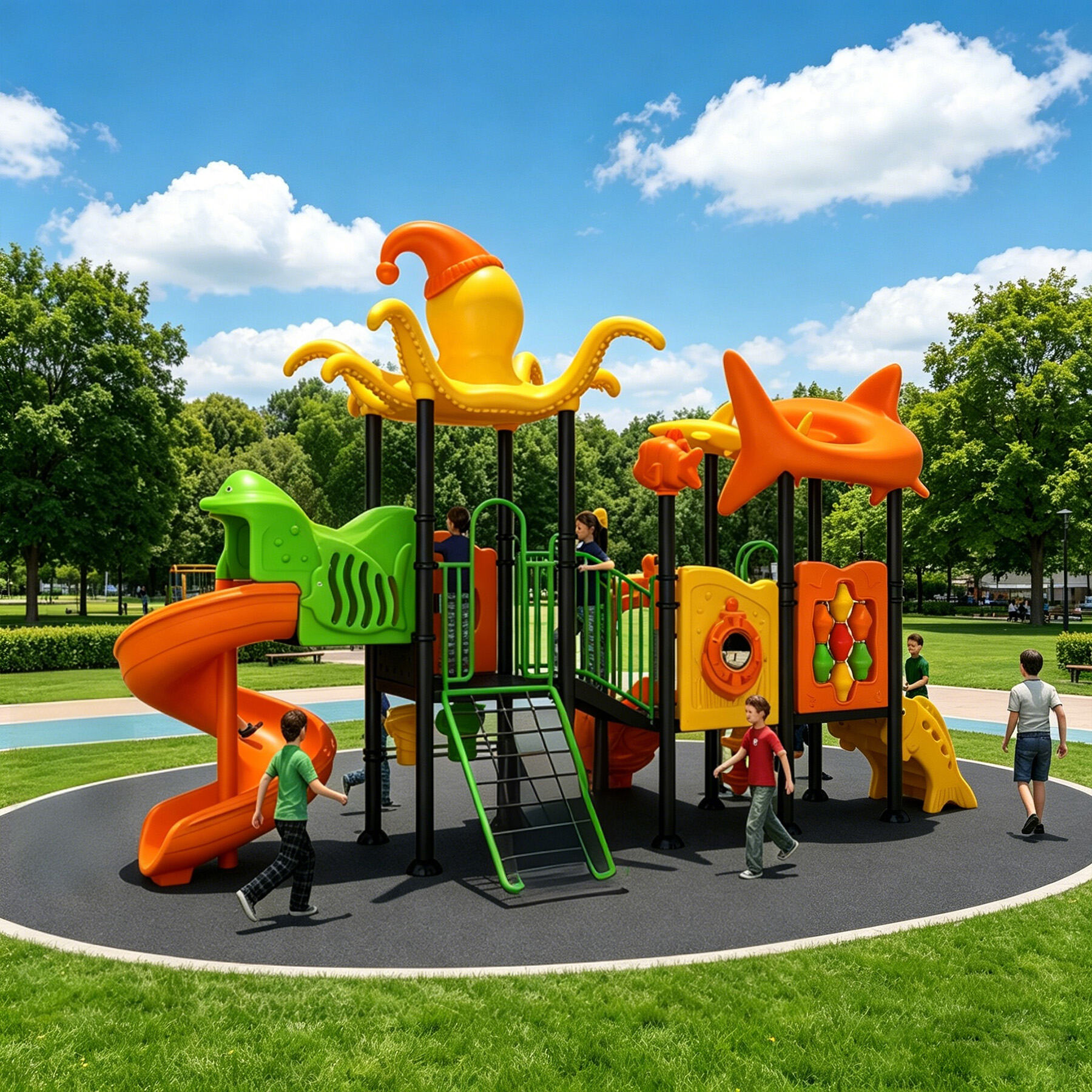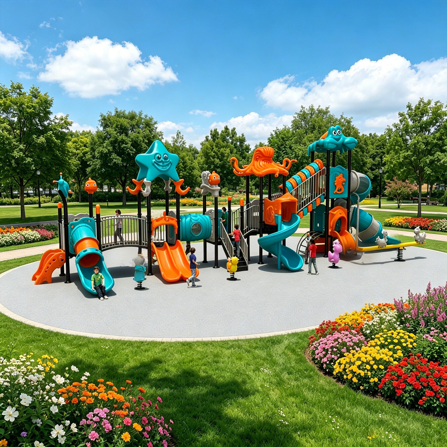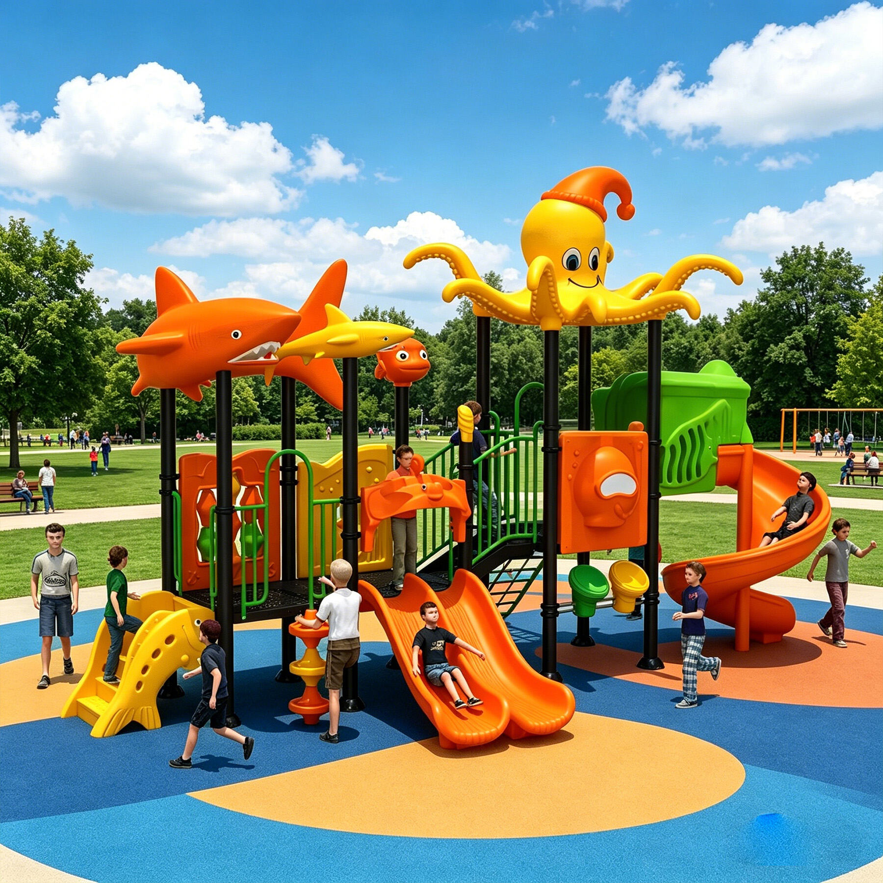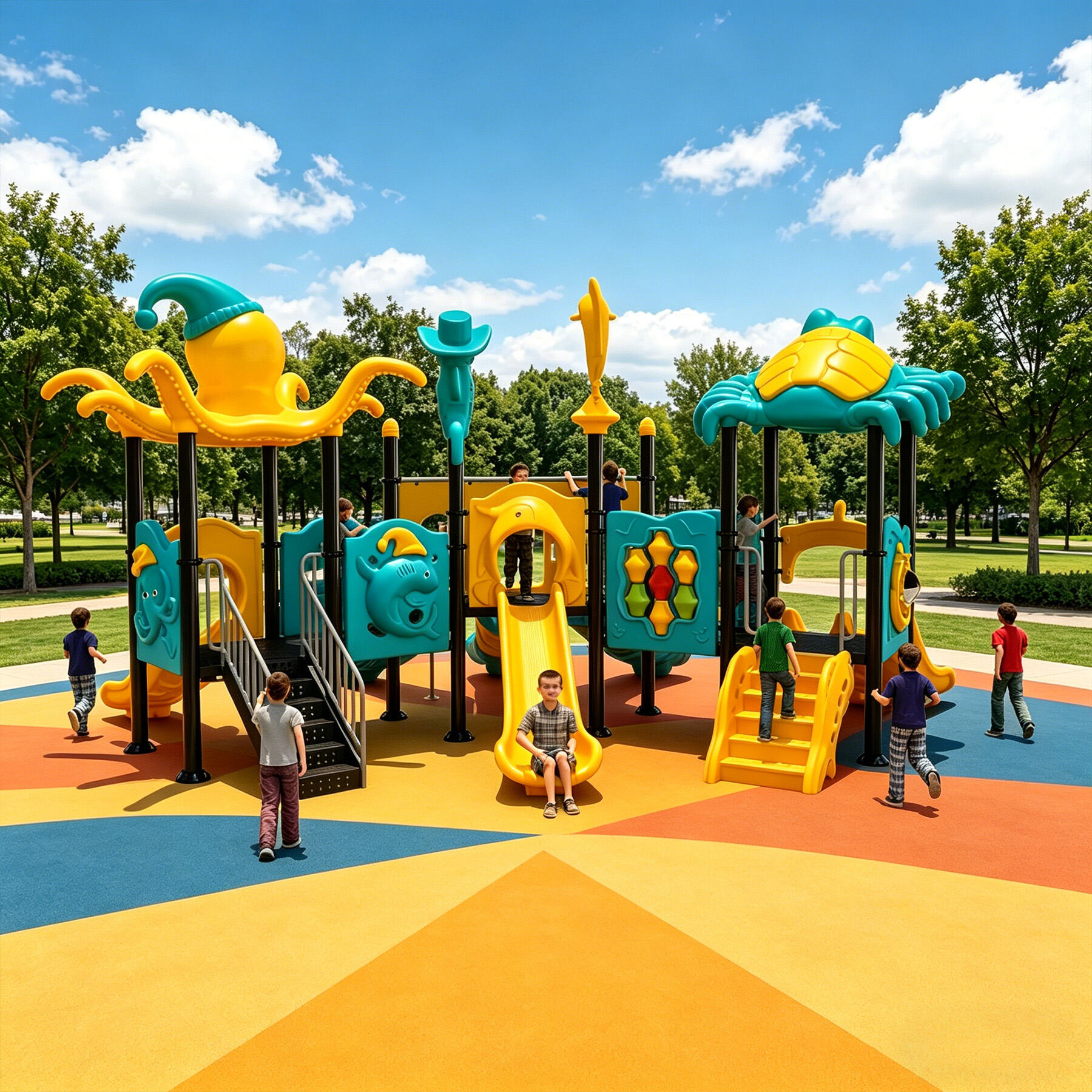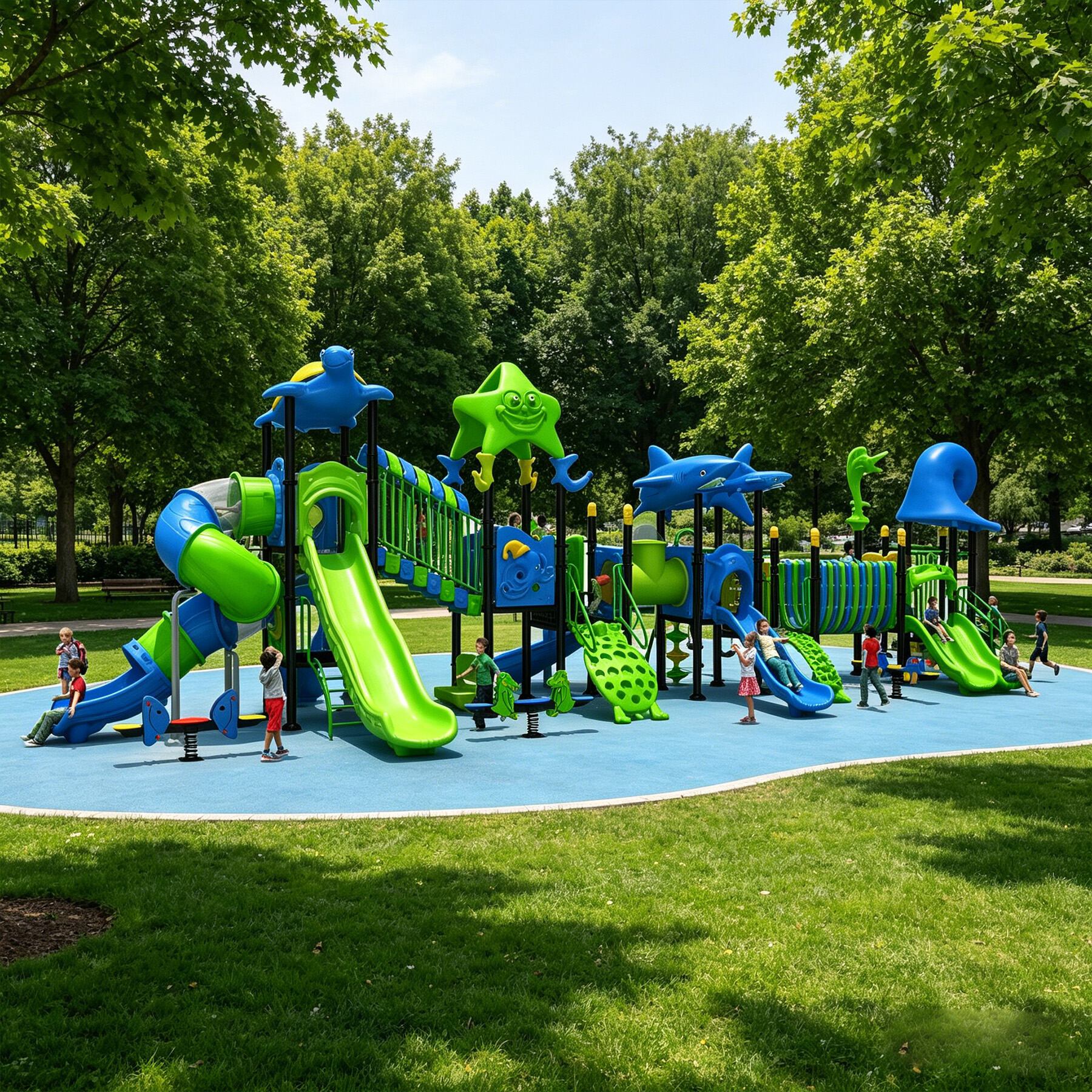 Designed specifically for children, the Ocean Series brings the deep and vibrant underwater world perfectly into playground settings. Featuring classic ocean-themed cartoon characters such as sharks, starfish, seahorses, swordfish, turtles, dolphins, and octopuses, each detail is cute, lively, and full of childlike charm.