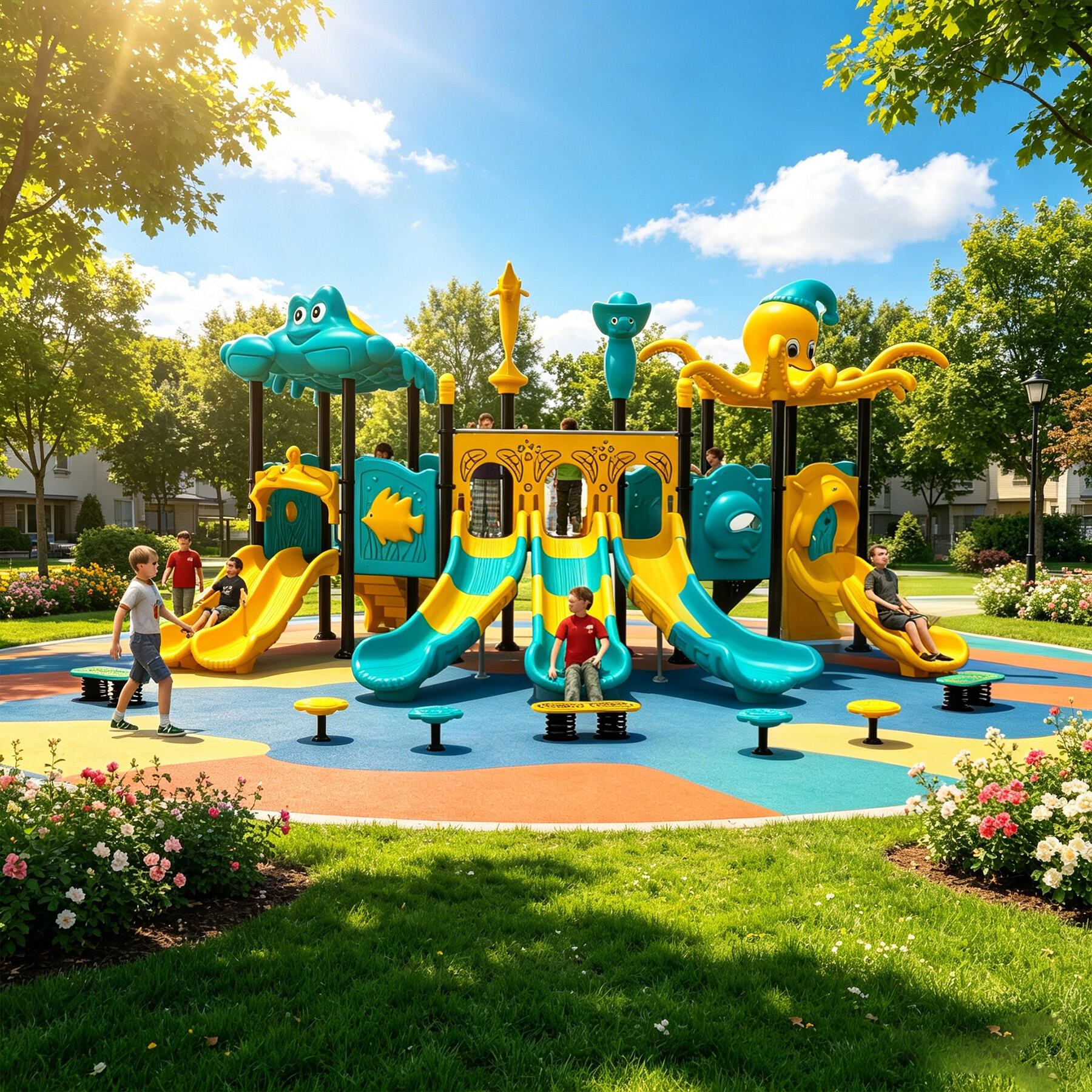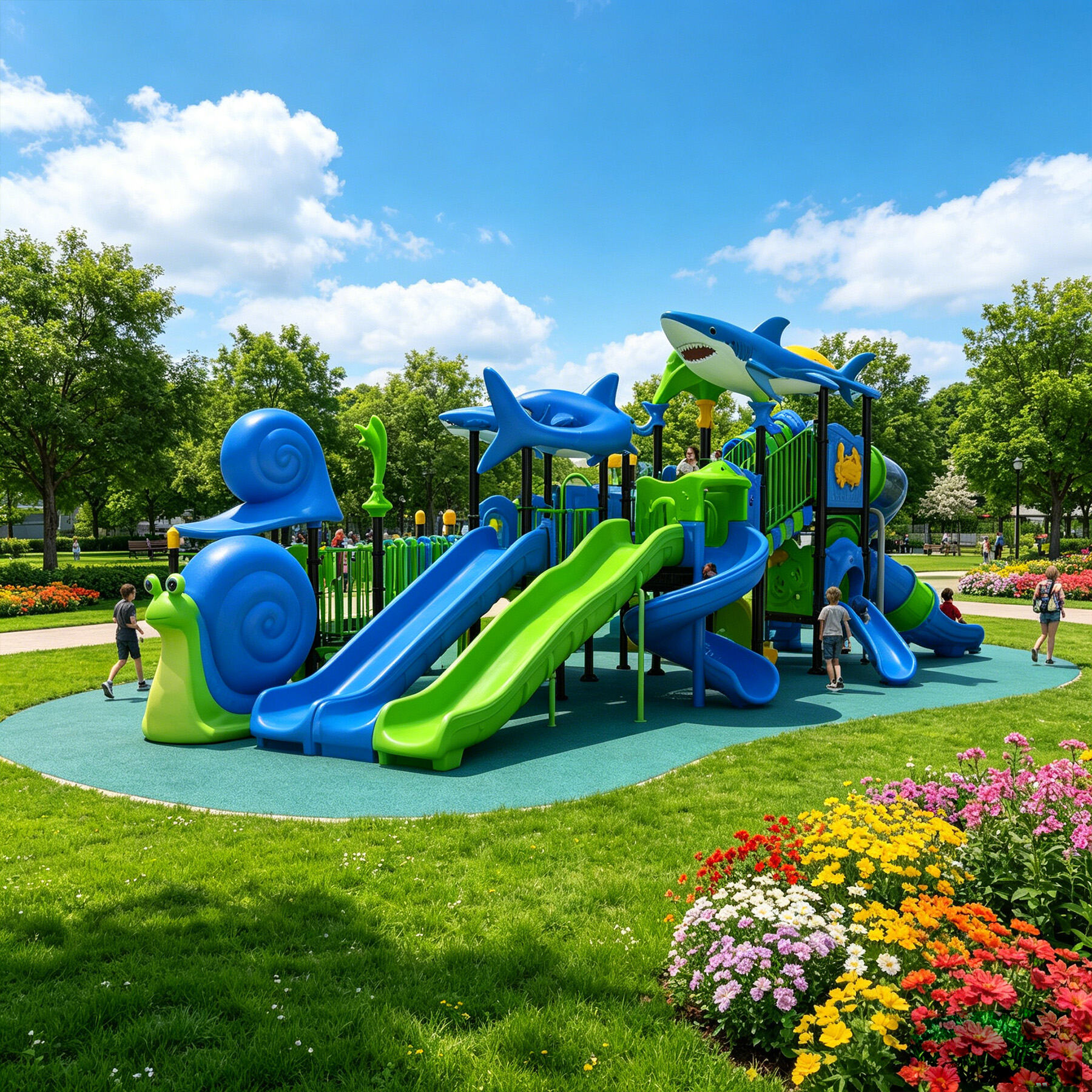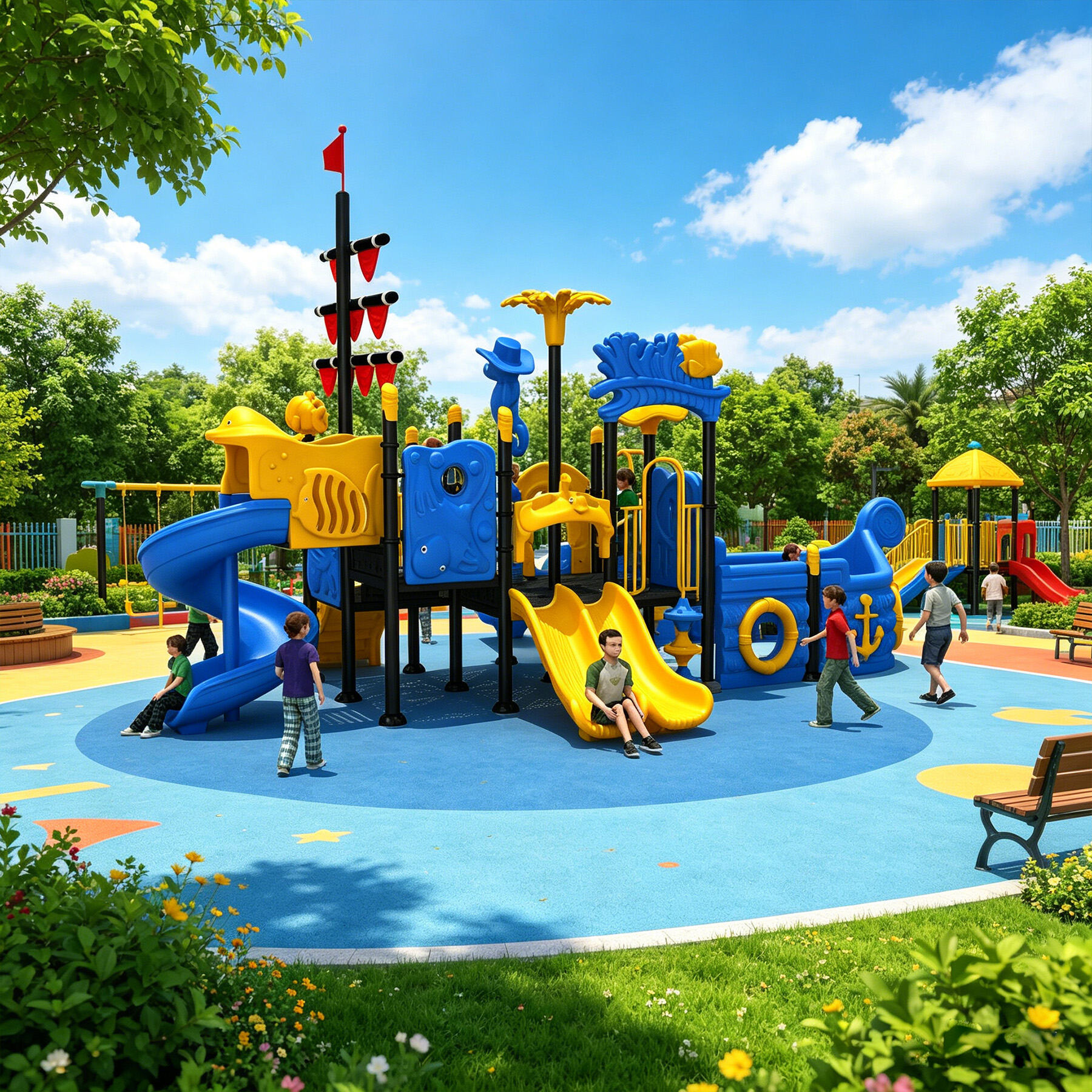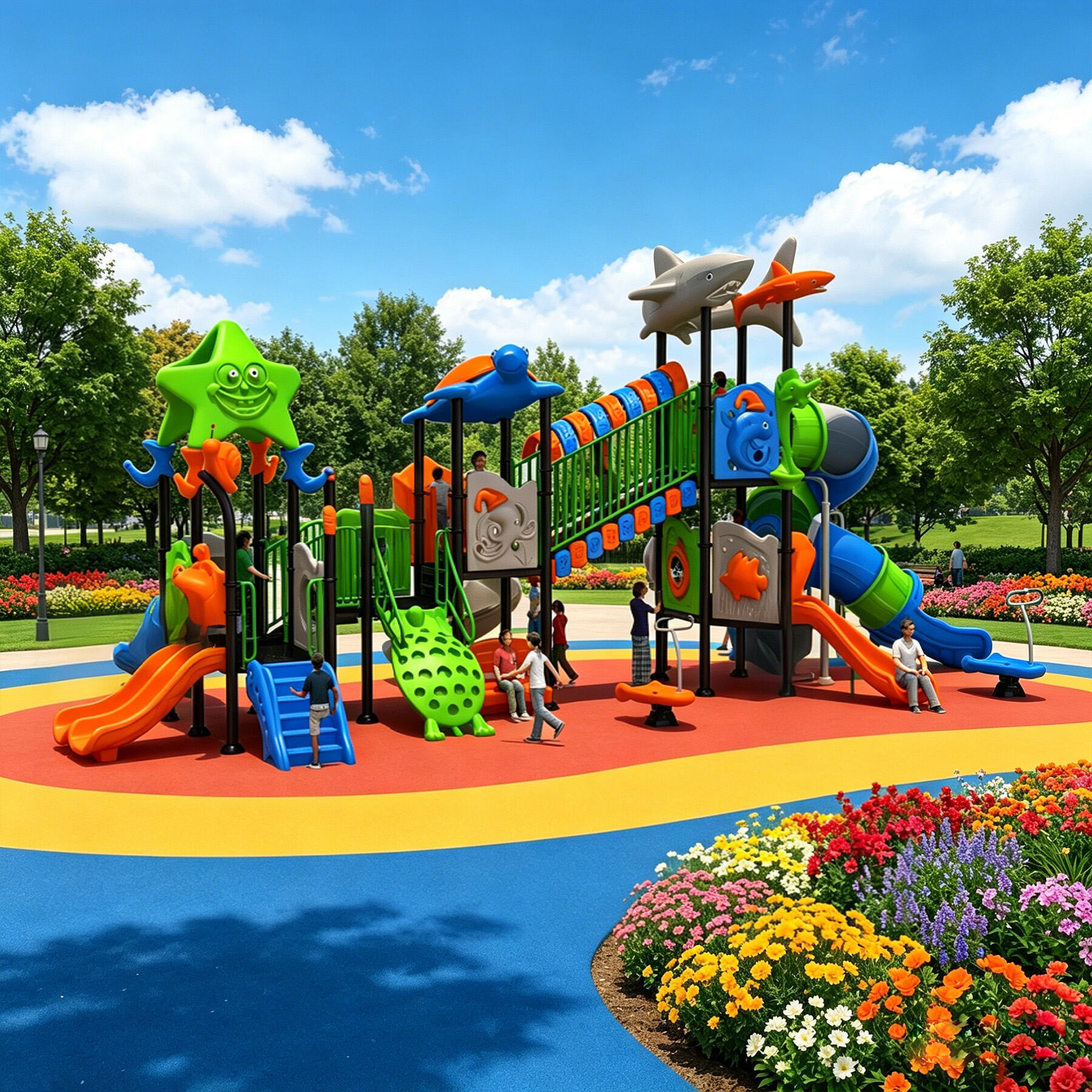 Designed specifically for children, the Ocean Series brings the deep and vibrant underwater world perfectly into playground settings. Featuring classic ocean-themed cartoon characters such as sharks, starfish, seahorses, swordfish, turtles, dolphins, and octopuses, each detail is cute, lively, and full of childlike charm.