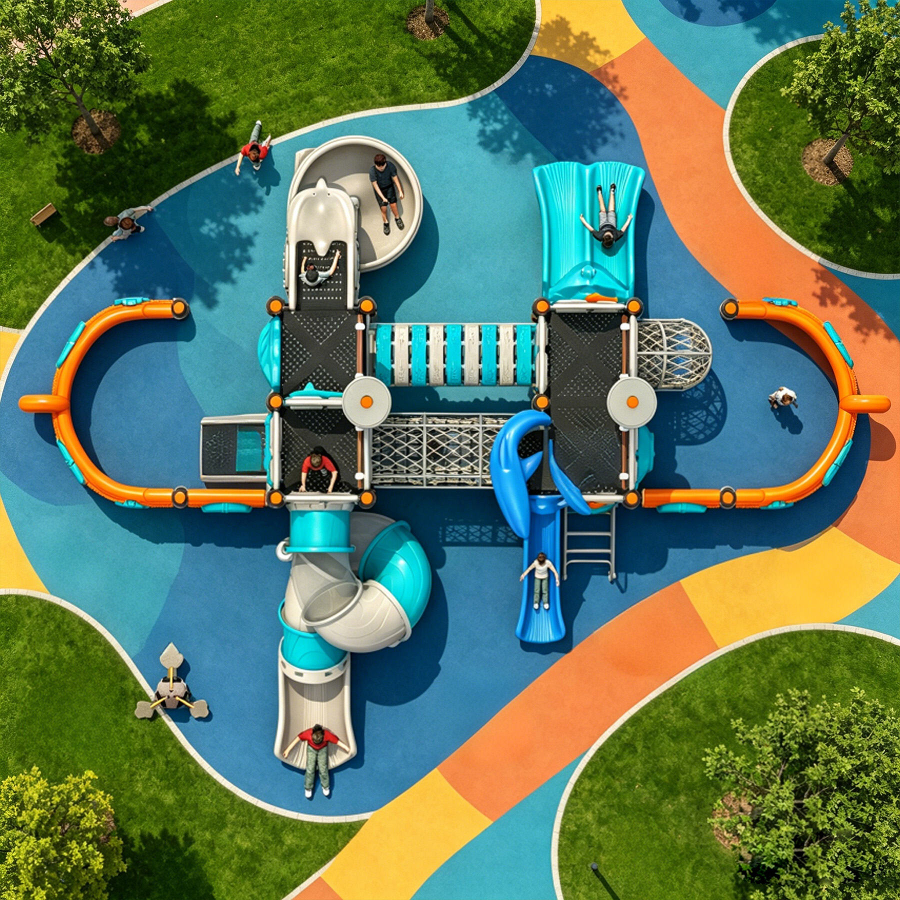 The slide bodies are made from imported plastic and treated with UV-resistant and anti-static processes to prevent aging, static buildup, and fading. The support columns are made of galvanized steel, finished with hot-baked coatings and UV stabilizers, ensuring corrosion and rust resistance while keeping colors bright and long-lasting.